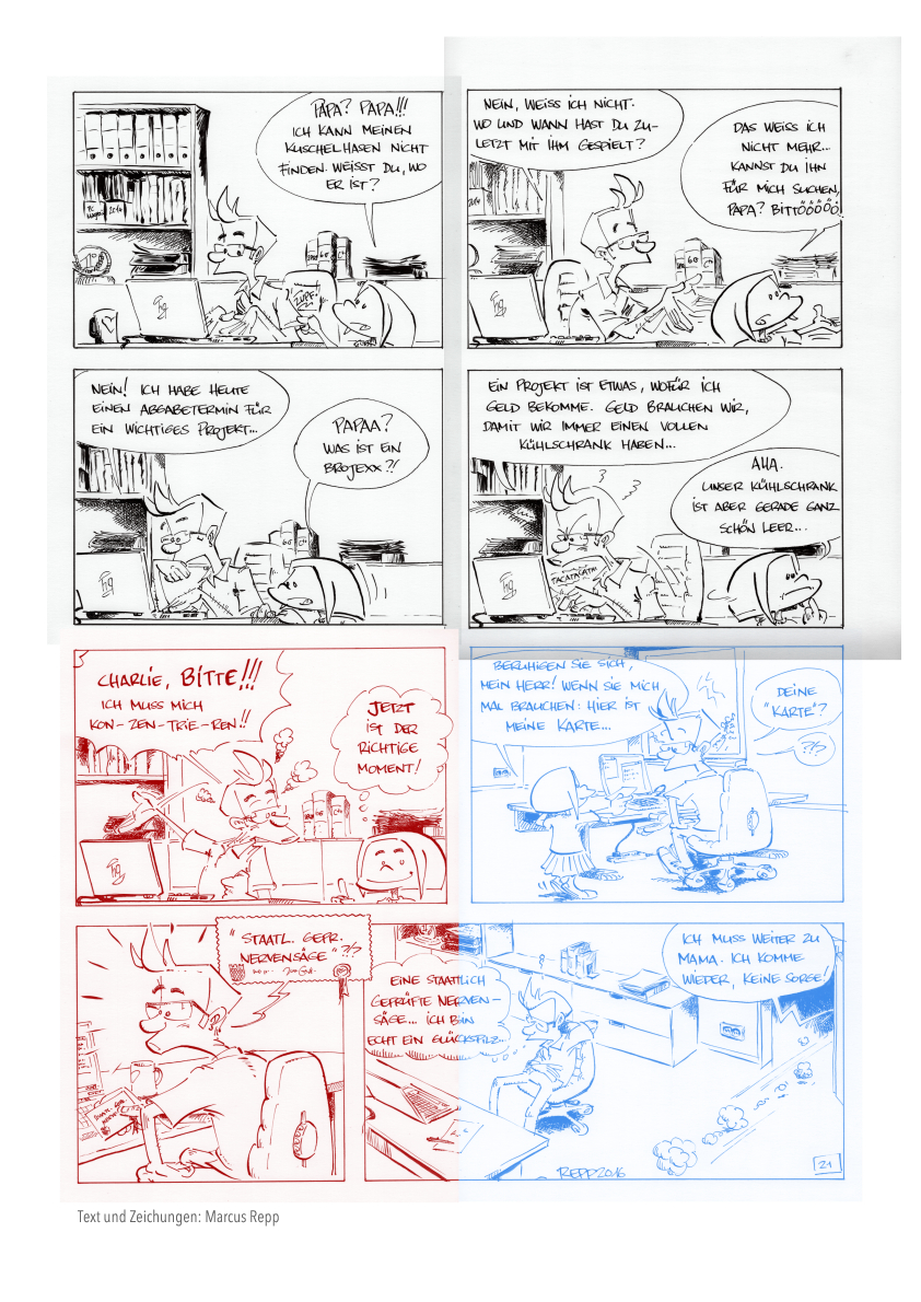 Im Original habe ich die Serie auf A2 gezeichnet, wobei ich für besseren Handhabbarkeit jeweils zwei A3 Seiten hernahm. Oder anders formuliert: jeweils zwei Bildzeilen sind in echt eine A3 Seite gewesen.